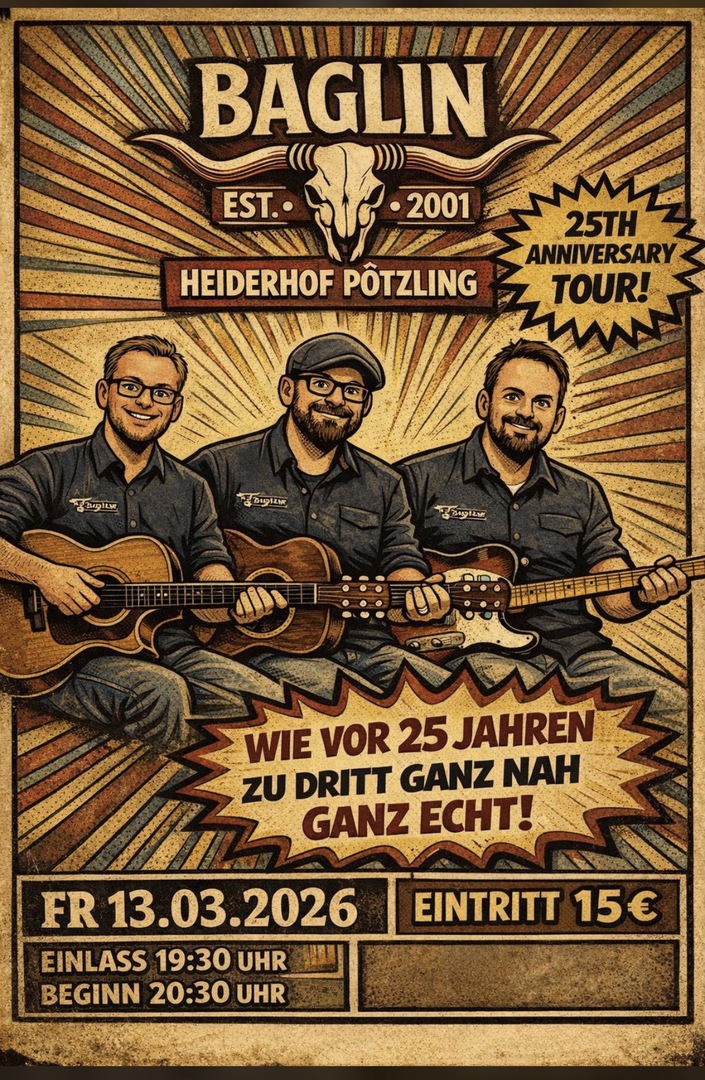 Die Setlist von BAGLIN umfasst dabei unsere Interpretationen von Rock ´n´ Roll-, Bluegrass-, Blues-, Country- oder Rocknummern. Wir arrangieren Songs von Johnny Cash, Elvis, CCR und Bruce Springsteen bis hin zu Dreiviertelblut oder Django 300. Songs zum Tanzen, Mitsingen, Feiern - Die Freude an der Musik und Ihrer Bewegung soll auch für unser Publikum im Vordergrund stehen....